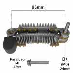 Nota: o parafuso B+ deste retificador tem 24mm de comprimento, medidos da ponta do parafuso até a superfície do retificador. O retificador suporta até 105A, tem 6 diodos de 35A cada, possui triodo, possui capacitor e não tem parte plástica.