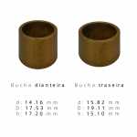 | Conteúdo da embalagem | 1 (uma) bucha dianteira de 14.16 x 17.53 x 17.20 mm nova 1 (uma) bucha traseira de 15.82 x 19.11 x 15.10 mm nova |