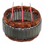 No estator é produzida a corrente elétrica do alternador, induzida pelo campo magnético que age nos fios das bobinas do estator.